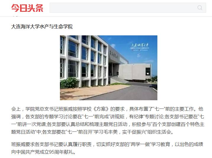 6月23日,大连新闻网今日头条以《喜迎建党95周年,掀“两学一做”学习热潮》为题做“两学一做”专题报道,其中报道了我校tyc122cc太阳成集团“两学一做”学习教育相关活动。tyc122cc太阳成集团党总支书记班振威按照学校《方案》的要求,具体布置了“七一”前的主要工作,要求切实抓好支部的“两学一做”学习教育,以出色的成绩向中国共产党成立95周年献礼。