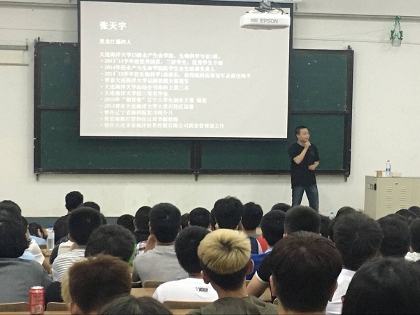 5月11日晚,tyc122cc太阳成集团在渤海校区阶梯一教室举办了以“追梦人,勇前行”为主题的大学生创新创业励志讲座。tyc122cc太阳成集团2016级辅导员魏佳敬、2013级生科2班张天宇及全体2016级学生参加大会。