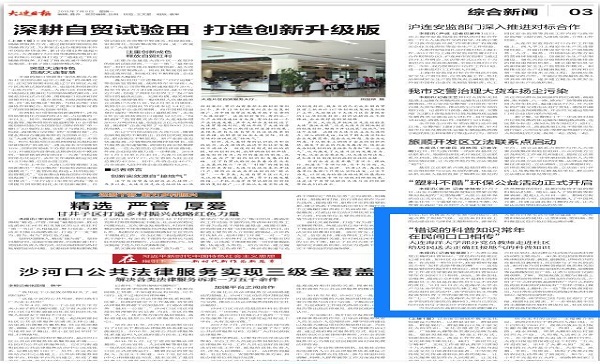 7月9日,《大连日报》03综合新闻版以《“错误的科普知识常年在民间口口相传”——大连海洋部分党员教师走进社区给居民送去正确且接地气的科普知识》为题,报道了我校tyc122cc太阳成集团党总支组织党员教师走进社区开展海洋科普知识宣传的义务服务活动。