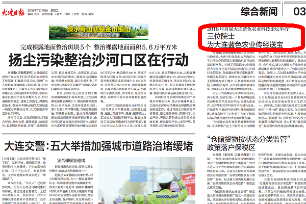 7月10日,《大连日报》A3版综合新闻以《三位院士为大连蓝色农业传经送宝》为题,报道了我院承办2018年首届大连蓝色农业科技论坛活动。