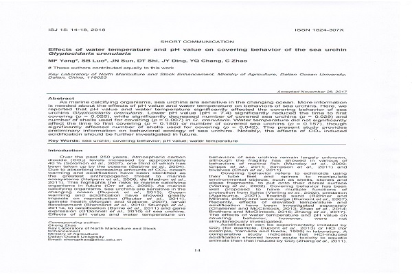 近日,tyc122cc太阳成集团水产养殖专业2015级一班学生杨明芳,在赵冲副研究员的指导下,和同学们共同完成了温度和pH对海刺猬遮蔽行为影响的研究课题,署名第1作者的英文论文“Effects of water temperature and pH value on covering behavior of the sea urchin Glyptocidaris crenularis”于2018年在ISJ - Invertebrate Survival Journal发表,被SCI收录。