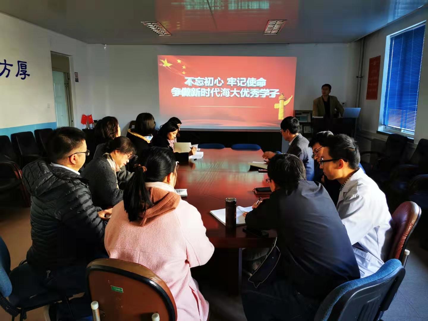 会上,张家润从不忘初心、牢记使命,不同的时代内涵,振兴东北发展,做时代海大学子,党的初心使命对党员干部的要求三方面进行了详细阐释,对新民主主义革命时期、社会主义革命和建设时期、改革开放时期和新时代”四个时期的党史、新中国史做了回顾,介绍了建校以来学院培养的海洋水产事业的优秀学子的事例,阐释了学校的校风、学风和蓝色大学的发展内涵。