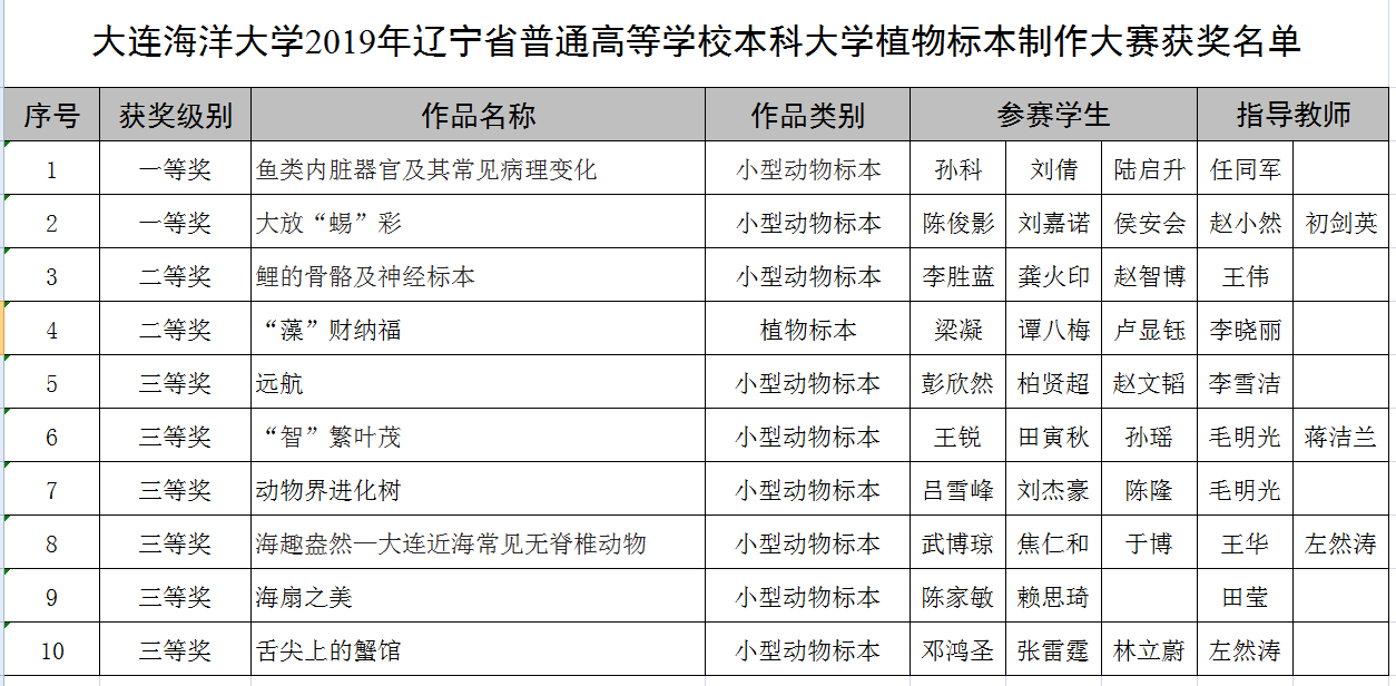 11月9日,2019年辽宁省普通高等学校本科大学生动植物标本制作大赛在沈阳农业大学举行。我校tyc122cc太阳成集团选送了 件作品,获得一等奖2项、二等奖2项、三等奖6项。
