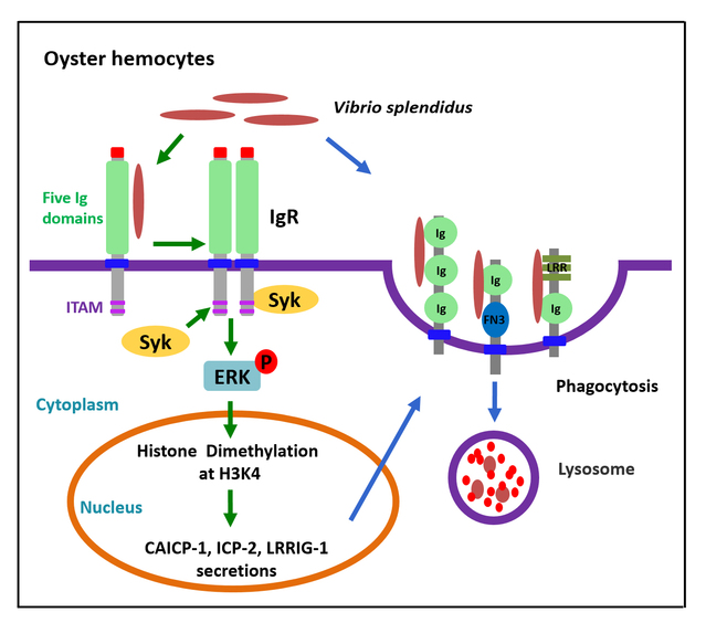 免疫记忆是当前免疫学领域关注的热点。鱼类中B/T细胞和免疫球蛋白(Ig)分子的发现,将抗体的产生追溯到了低等脊椎动物。近年来越来越多的研究提示无脊椎动物中存在免疫记忆现象,然而对于无脊椎动物免疫记忆的分子机制方面仍知之甚少。近日,Cell子刊iScience在线刊发我院孙洁洁副研究员题为“An ancient BCR-like signaling promotes ICP production and hemocyte phagocytosis in oyster”的研究论文。该研究从长牡蛎中鉴定出一个B细胞受体(BCR )样分子,该受体能通过其胞外的Ig结构域与病原菌结合,介导信号转导并促进细胞核中组蛋白甲基化修饰,最终诱导多种含有Ig结构域的蛋白(ICPs)表达。这一机制与高等动物B细胞受体介导的抗体产生机制类似。这些被诱导产生的ICPs通过与胞外的病原菌结合,进而介导血淋巴细胞对病原菌的吞噬,发挥类似抗体的免疫调理功能。该研究证明在古老的软体动物中存在类似于高等动物BCR分子及BCR介导的信号通路,为深入研究低等无脊椎动物的免疫记忆提供了重要参考,也为进一步探索高等动物BCR介导的抗体产生机制和适应性免疫的进化提供了线索。