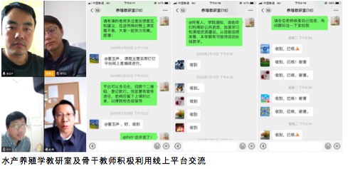 水产养殖学专业充分利用课程资源建设优势,积极开展在线教学工作。以专业负责人、教研室主任及骨干教师为工作小组,集中开展视频研讨,研判形势,评估课程建设进展情况,结合学院教学督导反馈意见,积极与授课教师沟通,形成良性的反馈机制。专业教研室工作群作为疫情期间专业教师主要的工作平台,及时发布教学相关信息,加强了与任课教师间沟通,为教师教学情况的反馈提供了基础,促进教学质量提升。