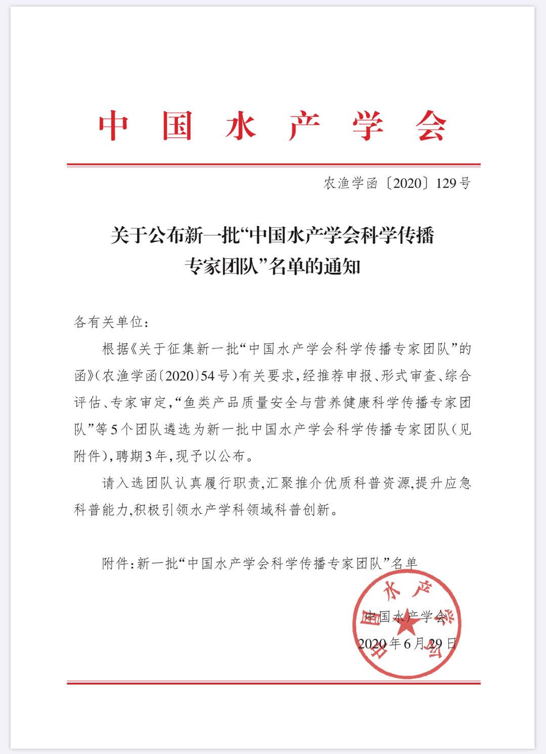 近日,中国水产学会公布新一批“中国水产学会科学传播专家团队”名单,我校常亚青教授团队入选(农渔学函【2020】129号)。