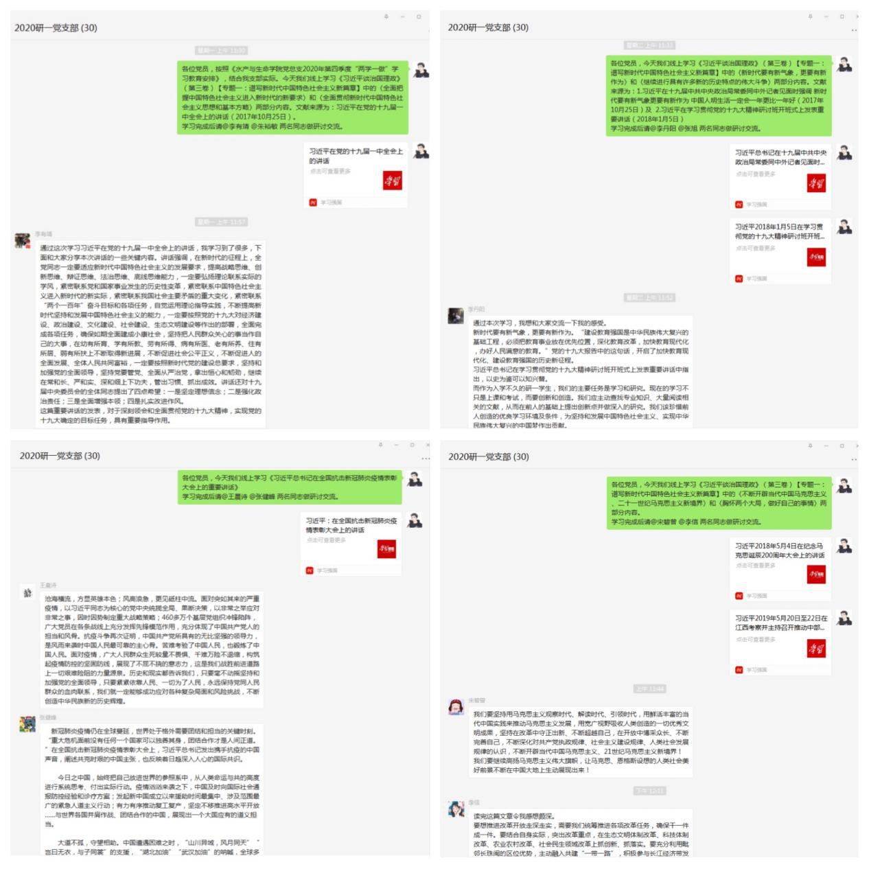 11月23日-27日,研究生第三党支部采用线上学习的方式,集体学习了《习近平谈治国理政》第三卷专题一中的6篇内容,以及《习近平总书记在中央政治局第二十一次集体学习时的重要讲话》和《习近平总书记在全国抗击新冠肺炎疫情表彰大会上的重要讲话》。每日学习完毕后,支部党员积极进行研讨交流,分享学习心得感悟。