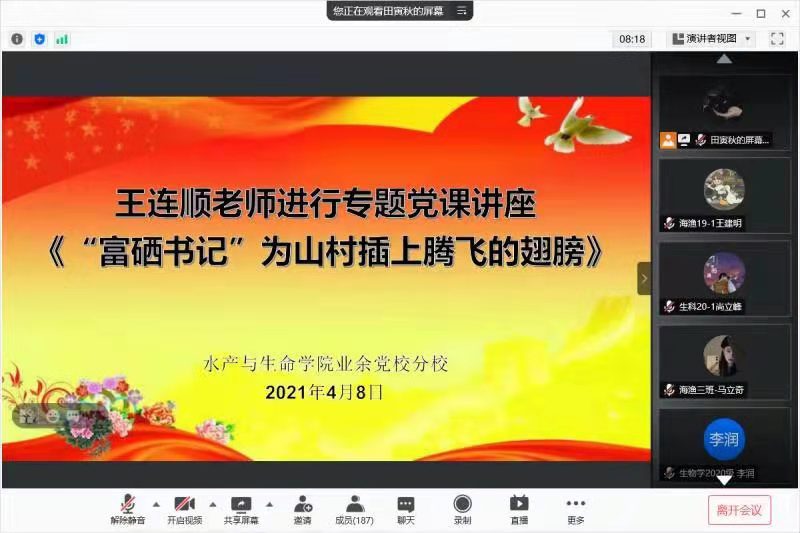 本次讲座特邀我院教师王连顺—朝阳县胜利镇于杖字的村驻村“第一书记”,在线上做题为《“富硒书记”为山村插上腾飞的翅膀》的专题讲座,王连顺向同学们介绍了其扶贫主要工作,并通过展示照片和视频进行了成果展示—富硒鸡蛋的成功培育,说明了微生物在农业生产中的重要性及发展前景,鼓励同学们积极学习科学文化知识,不断创新,到国家需要的地方去艰苦奋斗。