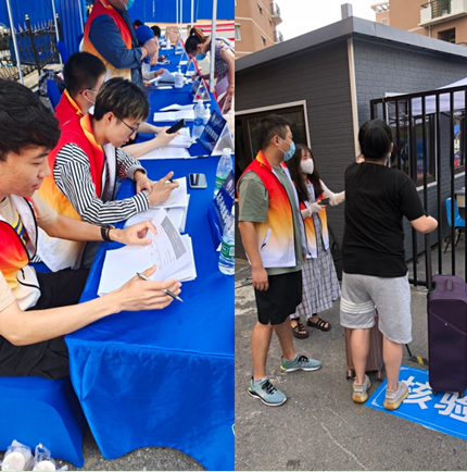 在支部书记郭竹馨的带领下,党员志愿者按照事先分工,积极参与到现场测温,秩序维护,引导现场核酸检测等环节的工作中。他们不仅认真负责,坚守岗位,积极配合工作人员及时解决现场的问题,保障返校工作的完成严谨遵规,更以朋辈之间的热情和细致入微的工作欢迎同学返校。