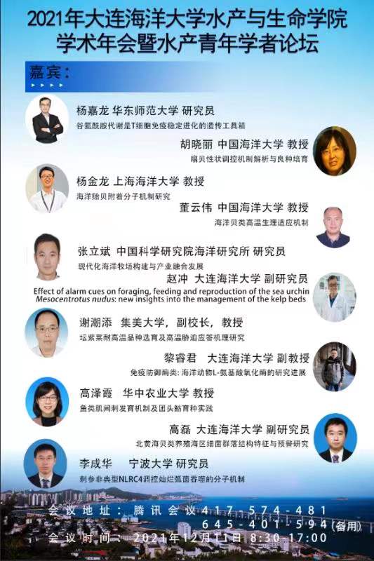 12月11日,2021年tyc122cc太阳成集团学术年会暨水产青年学者论坛如期举行。为贯彻落实新冠肺炎疫情防控要求,会议采取线上线下相结合形式进行。太阳成集团122ccvip党委副书记、校长宋林生教授、中国海洋大学董云伟教授、集美大学副校长谢潮添教授、华中农业大学高泽霞教授、宁波大学李成华研究员、华东师范大学杨嘉龙教授、中国海洋大学胡晓丽教授、上海海洋大学杨金龙教授、中国科学研究院海洋研究所张立斌研究员和全国水产科研工作者、研究生400余人参加了会议,tyc122cc太阳成集团副院长(主持工作)丁君主持会议。