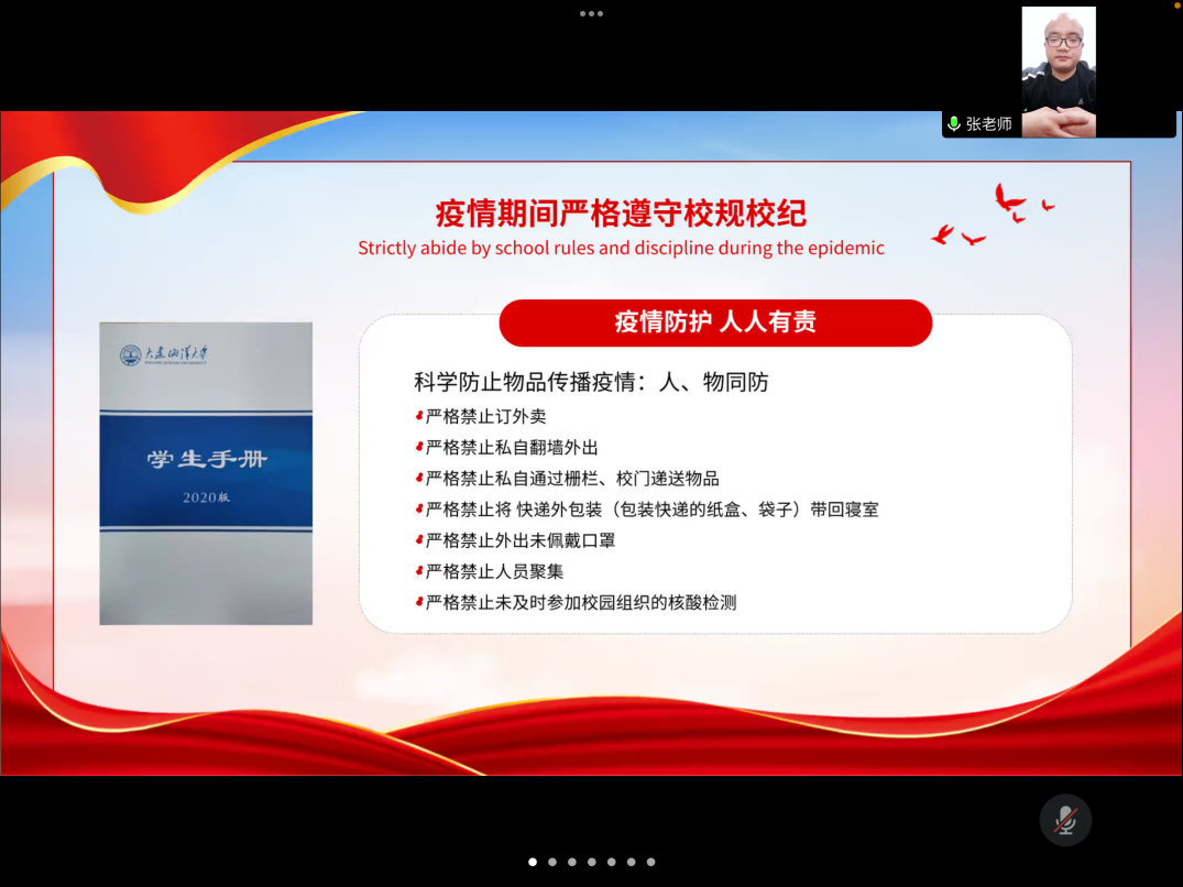 会上,辅导员张新从学校防疫措施及学生自身防疫两方面展开。他传达了学校网格化管理的总体要求,结合学院情况对学生分区学习、生活,错峰进行活动等代表学院提出了具体要求;同时他强调学生必须严格执行坚持佩戴口罩,取快递时不将外包装带出快递站等疫情防控的各项要求;以及调寝室要定期通风消毒,注意寝室卫生,网课期间注重上课效率等学习和生活上的相关问题。