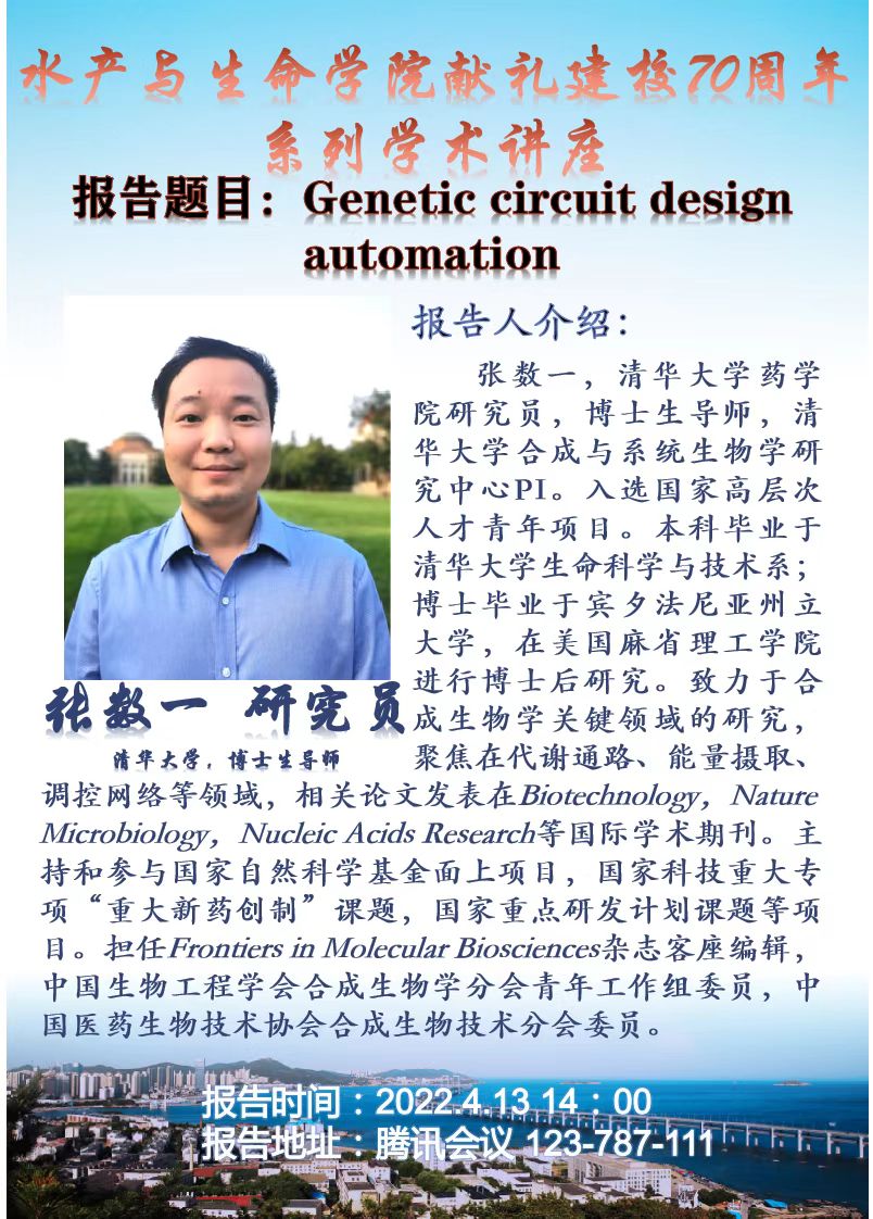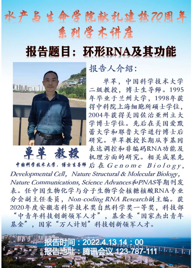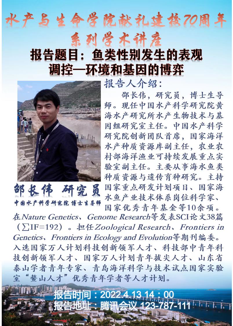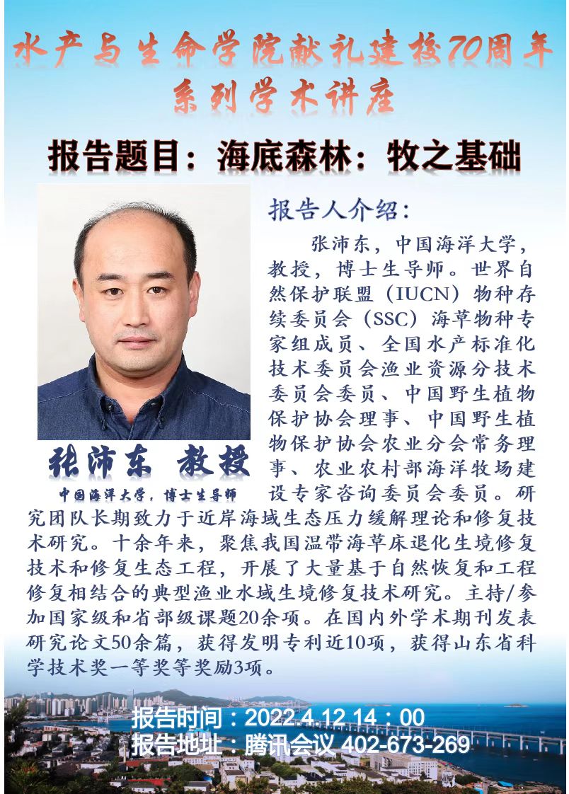 弦歌不辍,七轶芳华。2022年我校喜迎建校70周年,为进一步活跃校内学术氛围,水产学院将举办系列学术讲座。该系列讲座邀请了国内知名资深专家进行专题讲座。2022年4月12日和13日,学院邀请到了中国海洋大学张沛东教授、中国科学技术大学单革教授、清华大学张数一教授和中国水产科学研究院黄海水产研究所邵长伟研究员为大家带来精彩的学术报告。诚邀全校师生踊跃积极参加!