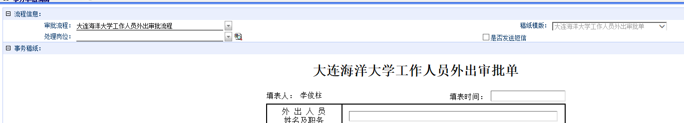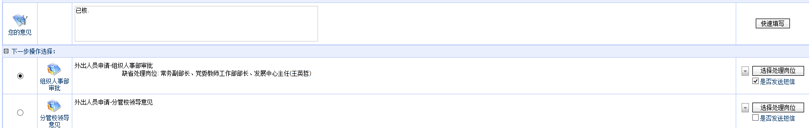 (9)外出人员登陆OA,填写意见,点选“组织人事部审批”,勾选“是否发送短信”,点击“提交”。