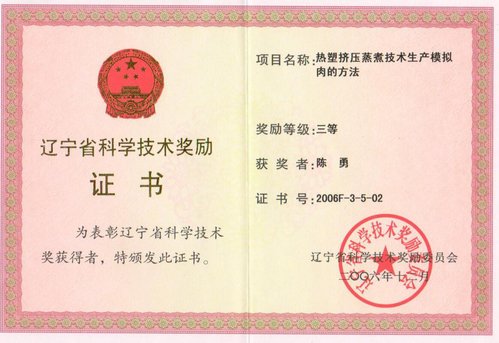 “热塑挤压蒸煮技术生产模拟肉的方法”获辽宁省科学技术三等奖