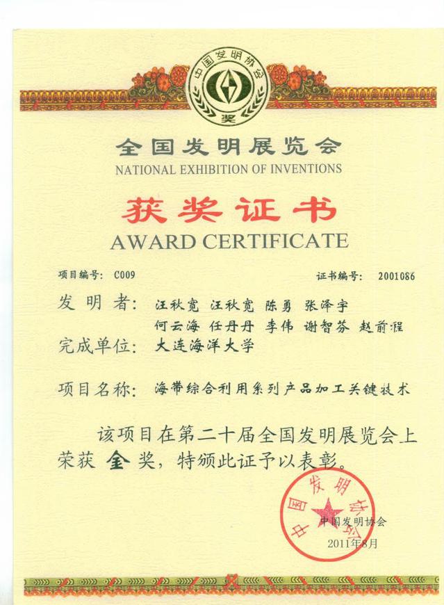 另外,2002年,陈勇的博士导师——东京海洋大学松生恰先生,无偿捐赠大连水产学院一套先进的海带汁加工设备,用于海带产品技术研发和教学,我校汪秋宽教授的研究团队从此开展了系统的海带加工技术研究和学生培养,发表论文多篇,专利多项,培养硕士研究生多名,并于2009年创立了国家级海带加工技术研发分中心。这套设备迄今仍在教学科研以及科技服务方面发挥着作用,为我国的海带加工事业做出了重要贡献,2008年我校“海带加工技术研究与示范”获得了辽宁省科技进步一等奖。