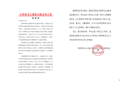 据悉,我校在赛事筹备和举办期间与主题赛事组委会密切沟通并提供了大量的协助工作,中国研究生乡村振兴科技强农+创新大赛组委会也向我校发来致谢信,并在感谢信中对我院的赛事筹备等相关工作致以感谢。