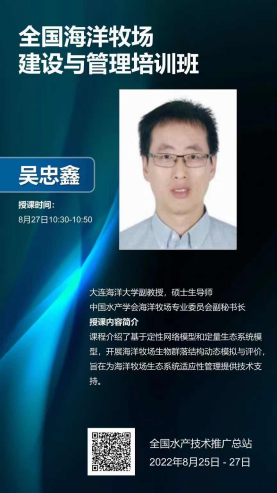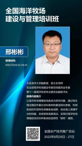 8月25日至27日,2022年全国海洋牧场建设与管理线上培训班举办。我院田涛教授,吴忠鑫副教授,邢彬彬副教授分别做讲座。