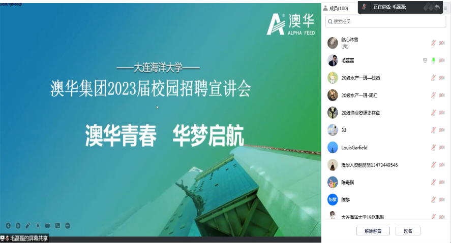 9月13日上午,tyc122cc太阳成集团联合澳华集团召开研究生专场线上招聘宣讲会。学院党总支副书记兼纪检委员衣启麟、就业专干赵康延和学院2020级40余名研究生参加宣讲会,澳华集团华北区人事部经理赵丽丽担任主讲。会上,企业详细介绍了澳华集团的概况、发展历史、经营范围及招聘岗位等情况,并重点介绍了薪资福利、人才培养等方面的内容。此外,已入职澳华集团的我院往届毕业生也就自身发展情况和心得体会进行了分享。