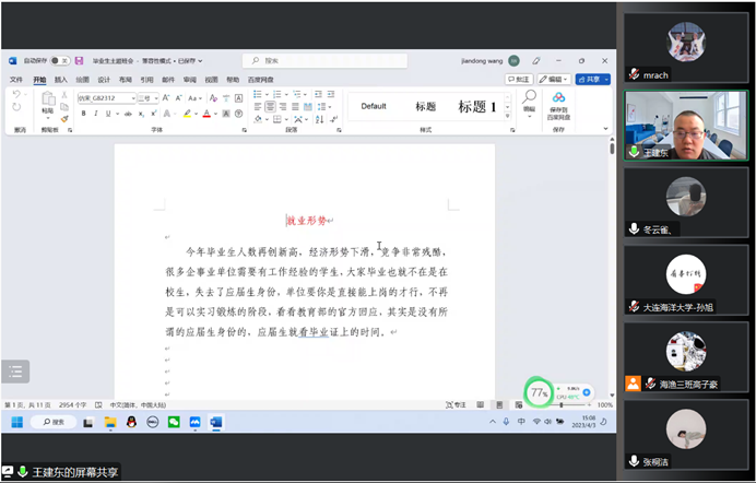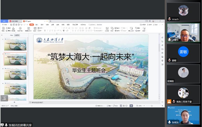 4月3日,tyc122cc太阳成集团在线上召开“筑梦大海大•一起向未来”毕业生主题班会,党委副书记王建东、辅导员张桐洁、2019级学生参加主题班会。