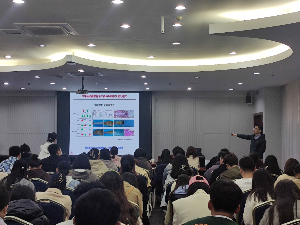 王显伟教授主要从事水产动物免疫与病害防控相关基础研究,主持国家自然科学基金优秀青年基金、面上项目和国家重点研发计划子课题等项目。报告中,王教授介绍了对虾养殖病害多发现状,病原感染和免疫逃逸,以及对虾肠道稳态机制的研究进展,阐述了通过维持肠道稳态预防疾病的理念。报告图文并茂,内容丰富充实,激发了老师和同学们的学术热情,并与王教授进行了热烈的交流与讨论。