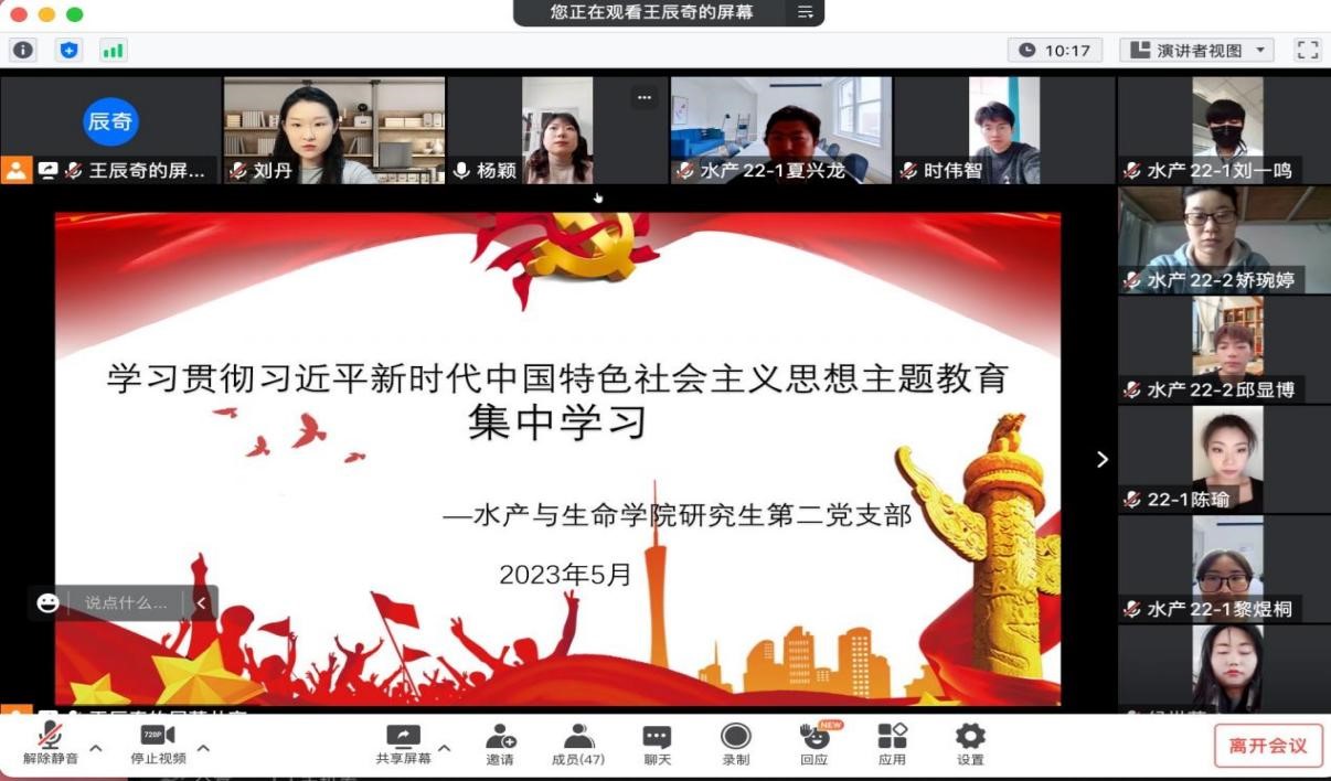 各支部党员结合自身岗位实践和专业生产实习,畅谈交流,大家纷纷表示要要落实党的二十大关于农业强国建设的部署要求,立足水产产业,把指导实习、科研和校企合作紧密结合起来,把课堂学习和乡村实践紧密结合起来,厚植爱农情怀,练就兴农本领,志存高远、脚踏实地,将论文写在祖国大地上,为加快推进农业农村现代化、全面建设社会主义现代化国家贡献力量!