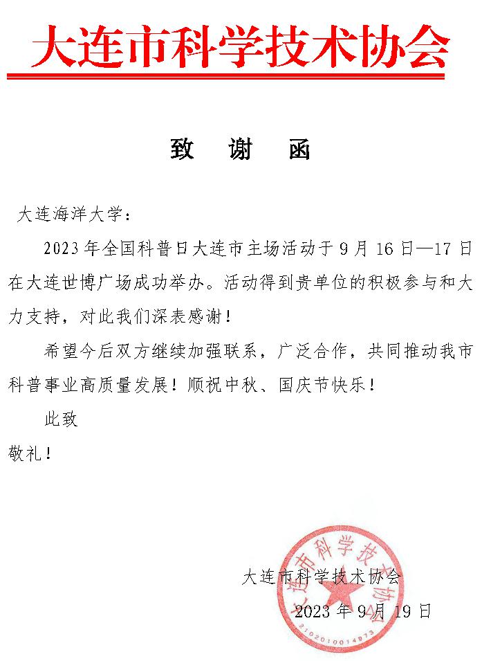 近日,大连市科学技术协会向我校发来感谢信。信中提到,我校积极参与2023年全国科普日大连市主场活动,并给予了大力支持,我院海洋微生物酶资源与硒工程团队充分发挥驻村第一书记作用,利用蓝色海洋技术创制系列高品质绿色富硒农副产品,助力乡村振兴。