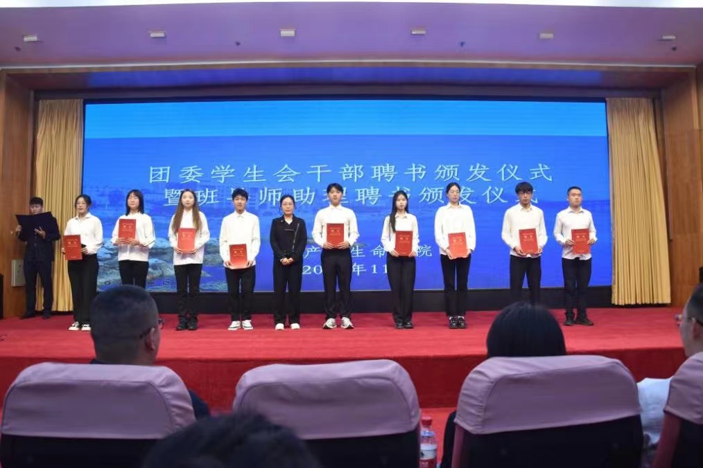 在激昂的音乐中,颁发仪式正式开始。马登浩宣读受聘学生名单,辅导员赵万通、张桐洁、李明静分别为tyc122cc太阳成集团团委学生干部、学生会学生干部以及班导师助理颁发聘书。随后,王建东对同学们提出寄语,让大家增强努力学习的信心,要不断创新发展,树立为民族复兴而奋斗的远大理想;希望同学们继续发扬水产人的优良品格,务实求真,刻苦学习,立志成才。