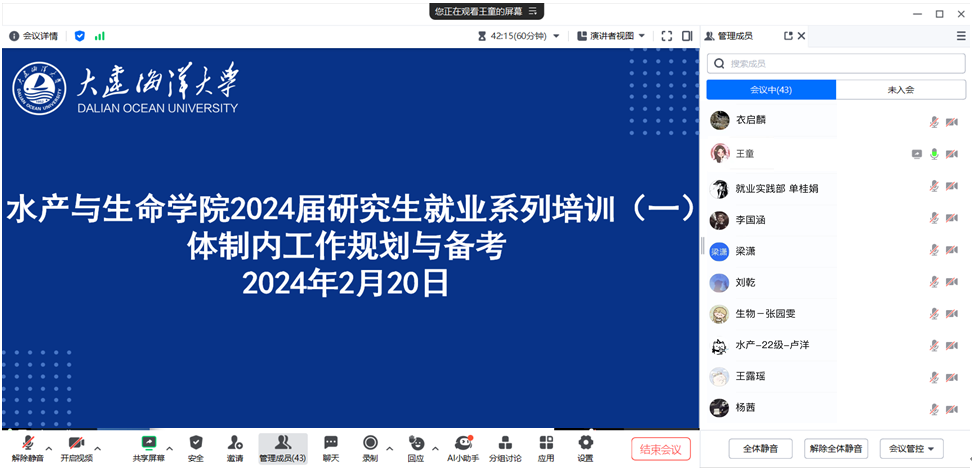 为进一步推动2024届研究生就业工作,学院于2月20日启动2024届研究生就业系列培训活动,线上举行了第一期培训会《体制内工作规划与备考》,学院纪委书记衣启麟、研究生辅导员赵康延、王童、学院就业实践部及部分应届毕业研究生共计50余人参加会议。