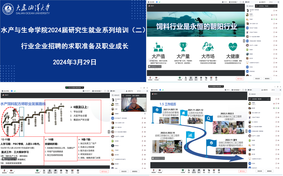 学院积极凝聚和发挥校友力量,邀请了现就职于海大动保事业部的2021届校友雷兆霖、现就职于澳华集团的2021届校友车延进、现就职于海大研究院水产饲料技术研究所2022届校友刘辉作就业培训。会上,针对近三年专业对口企业的岗位需求和人才要求,三位优秀校友结合自身求职经验和个人职业发展,主要从“行业现状介绍、企业岗位职责及定位、企业求职准备和个人职业发展路径”四个方面展开。三位校友详细介绍自己求职及工作经历,为同学们在职业选择、求职准备和能力提升等方面提供了宝贵的建议,同时也为毕业生提供了所在企业的岗位招聘信息。