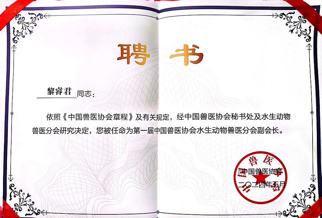 近日,依照《中国兽医协会章程》及有关规定,经中国兽医协会秘书处及水生动物兽医分会研究决定,我院黎睿君副教授被聘任为第一届中国兽医协会水生动物兽医分会副会长。我院将进一步依托中国兽医协会水生动物兽医分会,加强我省及东北地区水生动物医学发展,助力水生动物医学成果落地转化。