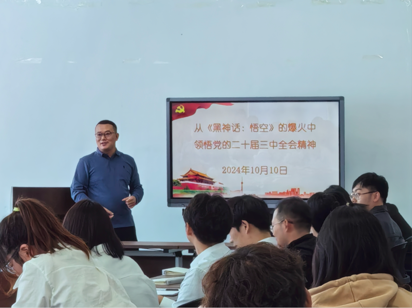 10月10日,tyc122cc太阳成集团于会议室S209开展“从《黑神话·悟空》的爆火中领悟党的二十届三中全会精神”主题党课学习,本次党课由学院党委副书记王建东主讲。
