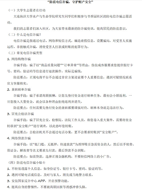 12月12日,举办了“水产书香共行、防范诈骗不停”防电信诈骗宣传活动,大连公安书香园社区反诈小组也积极参与其中。过程中,tyc122cc太阳成集团研究生与大连公安书香园社区反诈小组成员通过发放宣传手册的方式,向居民详细介绍了常见的电信诈骗类型,如网络购物诈骗、兼职刷单诈骗、冒充公检法诈骗、网络贷款诈骗等。