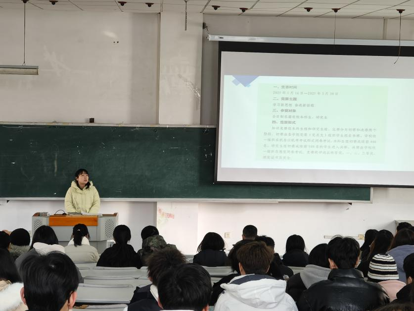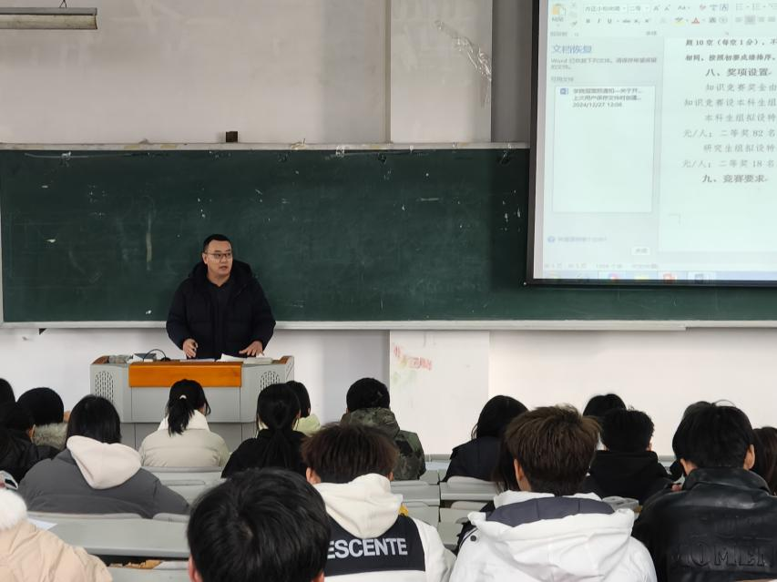 随后,孟丽婷详细讲述了知识竞赛的预通知,着重从竞赛形式、竞赛内容、参考资料、竞赛流程等方面阐述,详细讲解了竞赛流程,并列举了一系列参考资料,增强学生参赛信心。随后她强调本次竞赛是促进人才培养的重要舞台,鼓励同学们积极参加。