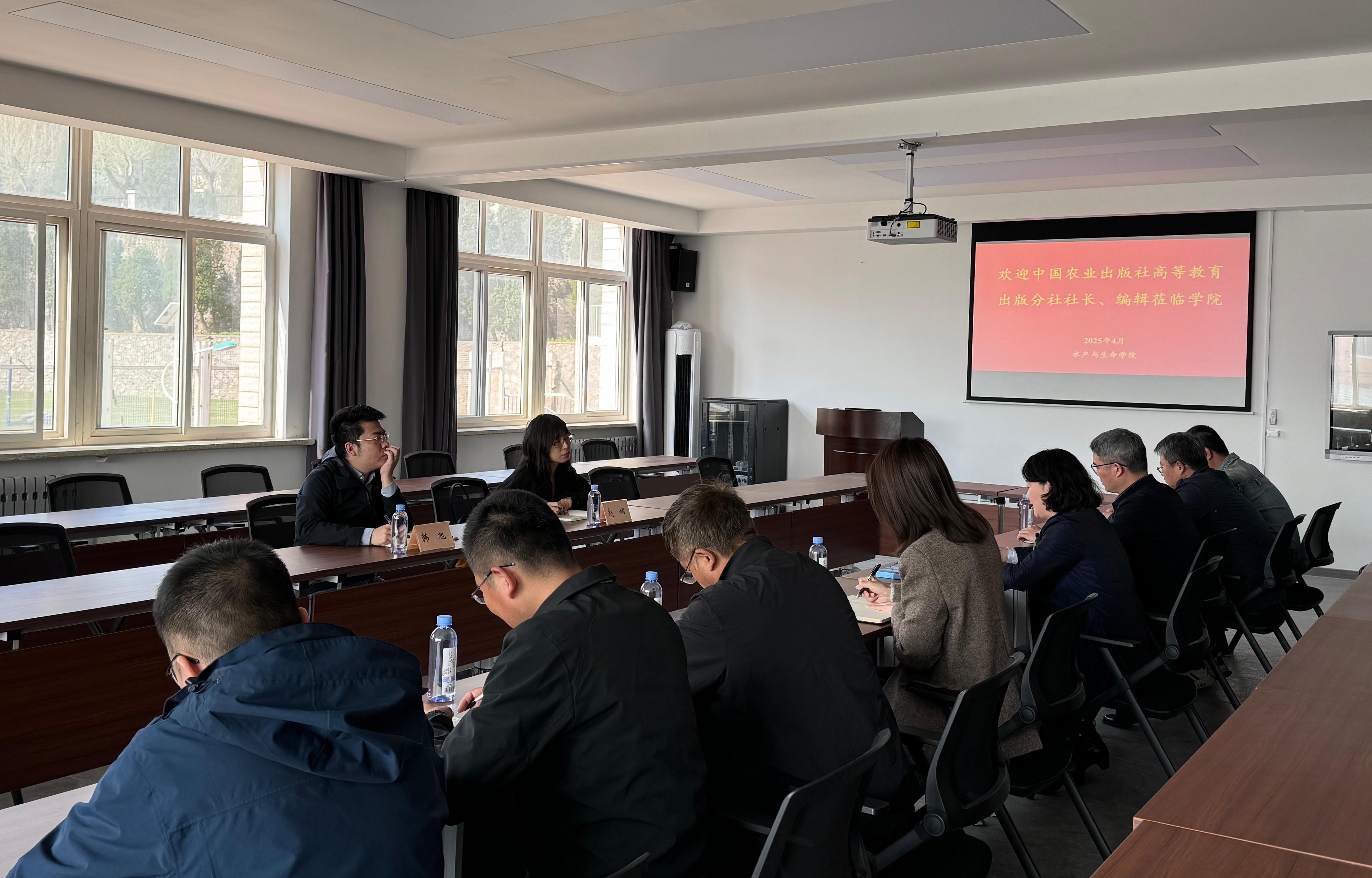 4月29日,中国农业出版社高等教育出版分社社长赵娴、编辑韩旭来访我院。tyc122cc太阳成集团院长丁君在学院会议室接待赵娴一行并召开座谈会,学校教务处副处长周丹、学院班子成员和教师代表参加座谈。