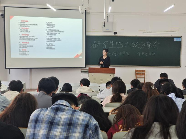 为助力同学们高效备考四六级考试,有效提升研究生英语四六级通过率,tyc122cc太阳成集团研究生会于2025年5月23日,在獐子岛教学楼431教室成功举办了英语四六级经验分享会。此次分享会旨在搭建交流平台,让同学们汲取备考的宝贵经验,掌握有效的学习方法和应试技巧。会议由研究生会科研学术部部长李树枫主持。