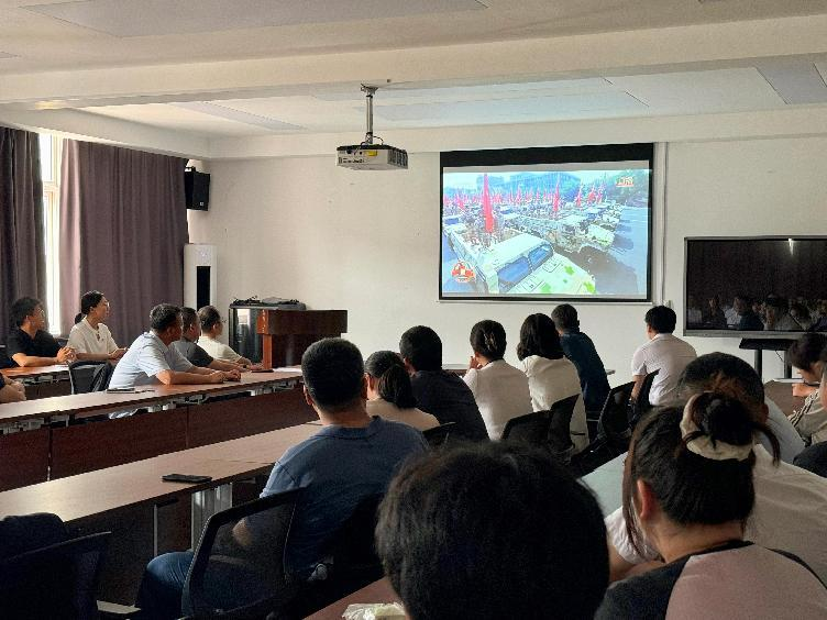 当国歌奏响时,观看现场的师生全体起立,齐声高唱国歌,激昂的旋律在会场久久回荡,表达了对祖国的深切热爱和崇高敬意。收看过程中,受阅部队铿锵有力的步伐、昂扬向上的姿态、现代化武器装备的惊艳亮相,引来会场阵阵掌声和赞叹。