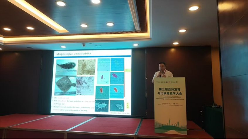 我院水生动物医学系黎睿君教授,团队研究生孙清美慧、赵书琪应邀出席本次会议。黎睿君教授围绕《Development of vaccines for fish scuticociliate》作分会场主题报告,系统阐述了该团队在鱼类寄生虫疫苗领域的最新研究进展、技术突破及应用前景,报告内容详实、见解深刻,引发了现场参会者的广泛关注与热烈讨论。研究生孙清美慧、赵书琪分别通过“Development of a parasite membrane protein vaccine for fish Scuticociliate”、“A Preliminary Study on the Regulatory Pathway of Immune Defense Enzyme IL4I1 in knockout Danio rerio by CRISPR/Cas9”主题墙报与国内外学者进行了深入交流。