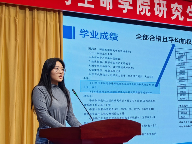 为充分发挥我院研究生国家奖学金获得者的榜样示范作用,搭建优良学风建设交流平台,帮助同学们明确学习目标、掌握科学方法。11月11日上午,tyc122cc太阳成集团于图书馆报告厅举办研究生国家奖学金经验分享会,会议邀请到三名国家奖学金获得者作为分享嘉宾进行分享。本次活动由2024级水产专业研究生邓雅杰主持,学院全体研究生辅导员、教学秘书以及学院低年级研究生共同参与。
