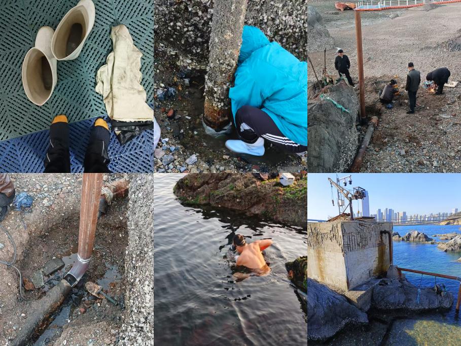学校南院海上泵房及抽蓄水管道为校园海水供应的重要设施,被喻为我校水产渔业相关实验室的“生命线”,长期支撑着大量的科研与教学工作。但自今年11月以来,位于18号楼蓄水池上水量大幅减少,我院曹淑青老师多次下水,清理吸水管头后也未见好转。月中旬大汛潮期间曹老师凭借多年工作经验,仔细巡检,排查到海上抽水管存在裂口及泵壳锈蚀漏水的问题。然而,维修更换损坏的抽水管需要在退大潮期间很短的时间内方可进行,其难度非同寻常。