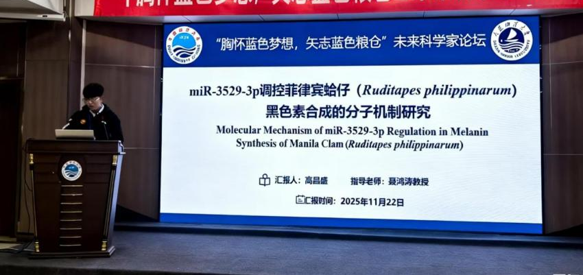 高昌盛同学报告题目为“miR-3529-3p调控菲律宾蛤仔(Ruditapes philippinarum)黑色素合成的分子机制研究”,本研究系统阐释了miR-3529-3p通过靶向TYR介导菲律宾蛤仔黑色素合成的分子机制,不仅为理解贝类壳色形成的非编码RNA调控网络提供了新见解,也为壳色性状的分子改良提供了新的理论依据。